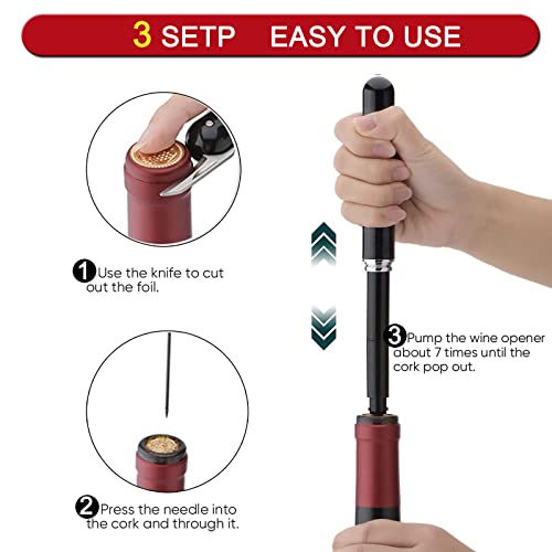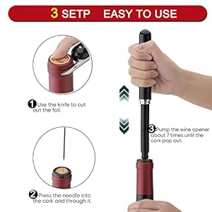 【Effizient und praktisc】h: Der Weinflaschenöffner mit Luftdruck ist einfach, bequem und leicht. Bei der Verwendung einfach den Weinkorken mit der Nadel durchstechen, den Griff halten und die Luft für 3-7 Mal nach oben und unten ziehen, um den Korken herauszunehmen, ohne den Korken und die Flasche zu zerstören oder Holzschneiden zu produzieren. Es ist sauber und hygienisch und kann nach der Reinigung viele Male verwendet werden.