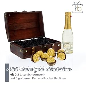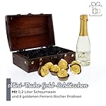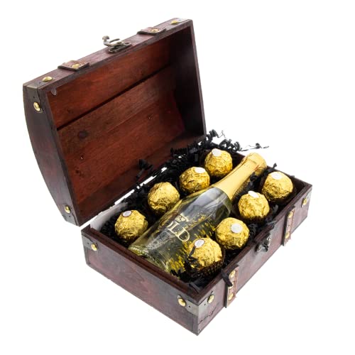 GESCHENK TRUHE: Entdecke unseren Goldschatz, der in einer echten Holztruhe 0,2l Schaumwein mit 22 Karat Goldpartikeln und 8 goldenen Knusperpralinen von Ferrero Rocher zu Dir nach Hause bringt.