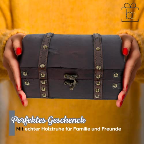 ABMESSUNGEN: Die Truhe misst ca. 22 x 15 x 9,5cm und eignet sich somit nicht nur zum Überreichen des Schatzes als Geschenk, sondern auch danach noch als Aufbewahrung für Zuhause.