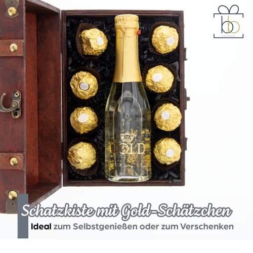 Bull & Bear Geschenk Mini-Truhe Gold-Schätzchen, Truhe mit 0,2l Sekt mit echtem Blattgold 22 Karat und 8 Rocher Pralinen