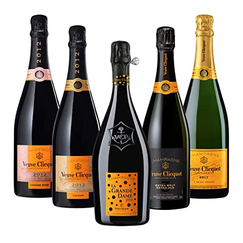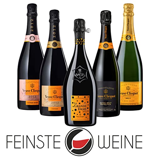 Unser Champagnerpaket besteht aus: 1x Veuve Clicquot Brut Yellow Label | 1x Veuve Clicquot Extra Brut Extra Old | 1x Veuve Clicquot Vintage Rosé 2012 | 1x Veuve Clicquot La Grande Dame 2012 | 1x Veuve Clicquot Vintage Blanc Brut 2012