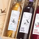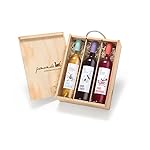 Holzkiste in traditionellem Design, gefüllt mit unseren Hausweinen. Wunderschön verpackt und dekoriert mit heller Holzwolle. Ideal als Geschenk!